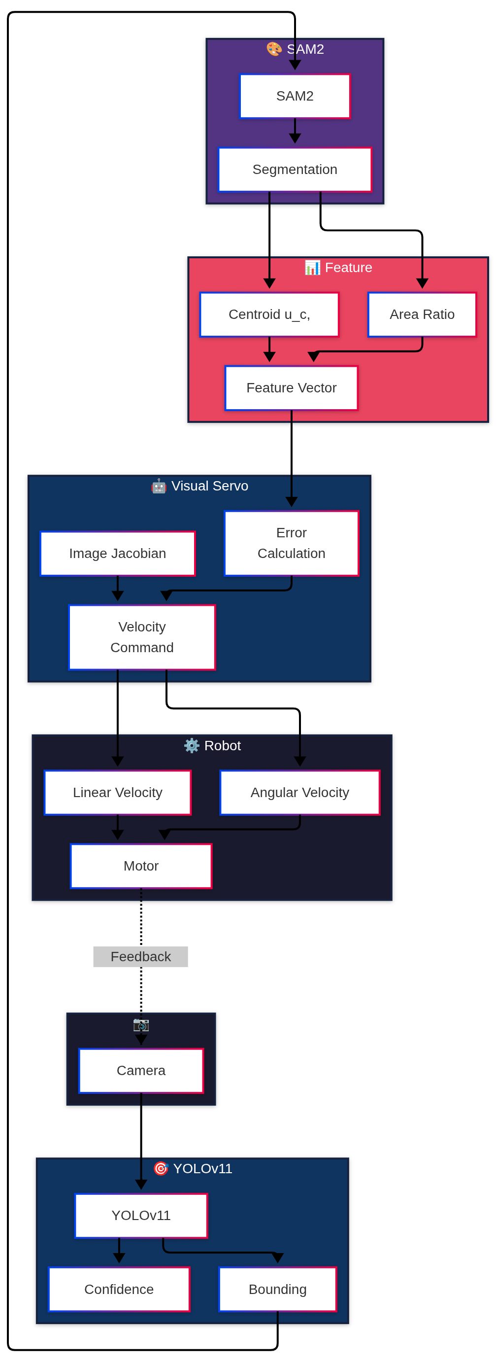 This follow-me system demonstrates the successful integration of modern deep learning techniques (YOLOv11, SAM2) with classical control theory (visual servo control). The combination provides robust, real-time target tracking and following capabilities suitable for autonomous robot applications.