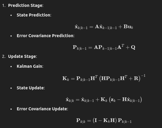 As previously mentioned, understanding the Kalman Filter from definitions and complex equations alone is nearly impossible. Therefore, in most cases, state matrices are simplified, resulting in the more manageable equations shown below: